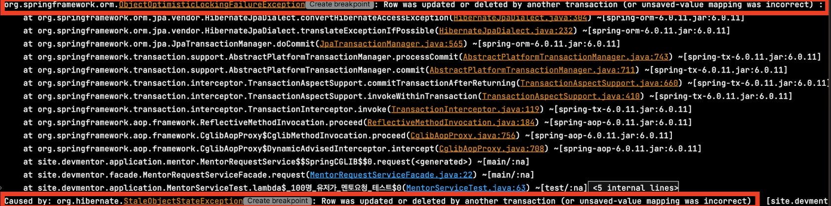 예외가 발생하고 이를 spring 에선 ObjectOptimisiticLockingFailureException 으로 처리하는 것을 볼 수 있습니다.