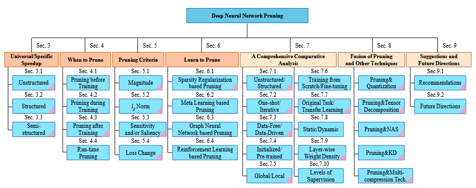- 딥 뉴럴 네트워크 가지치기(Pruning)에 대한 포괄적이고 체계적인 리뷰 제공