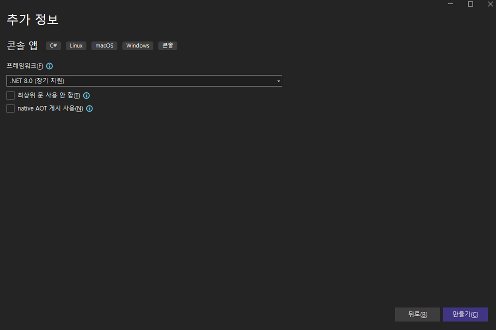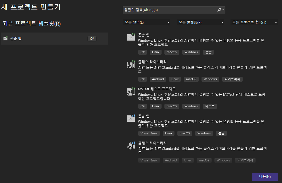 C++ 과는 다르게 빈 프로젝트가 아닌 콘솔 앱 을 선택해서 프로젝트를 생성한다.