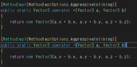 Unity 에서 흔히 사용하는 Vector3 의 +,- 도 operator 를 사용하였다.