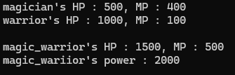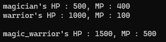 Console.WriteLine($"magic_warrior's HP : {magic_warrior.Hp}, MP : {magic_warrior.Mp}");