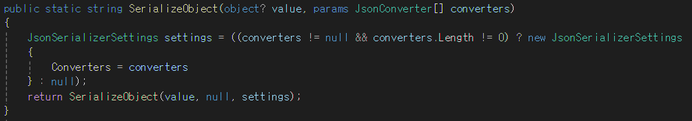 매개 변수 : value (Json 으로 변환시킬 객체) , converters(직렬화 되는 동안 사용되는 변환기 모음)