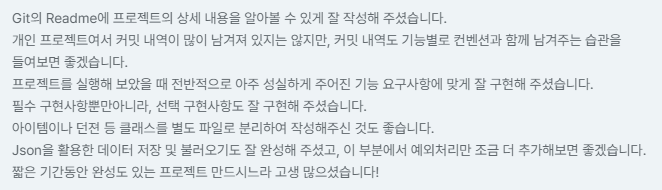 어제 작성한 TIL 과 제출한 개인 프로젝트 과제의 피드백이 왔다.