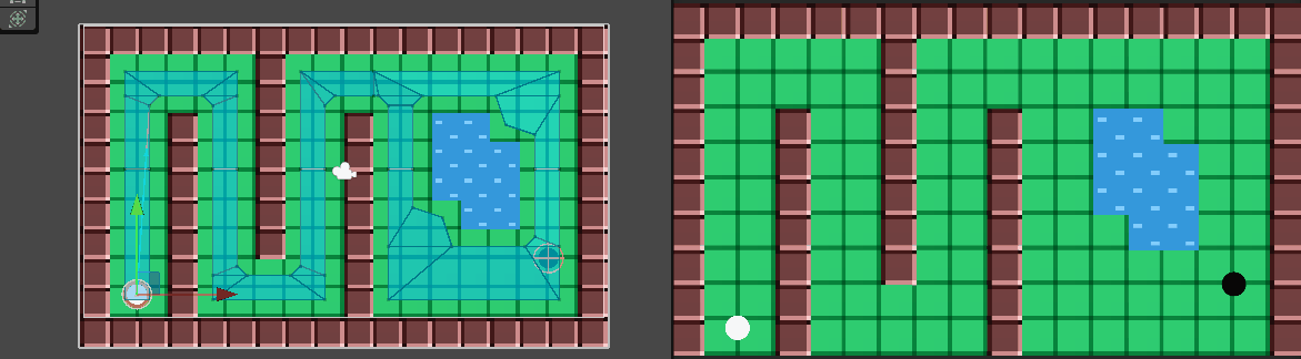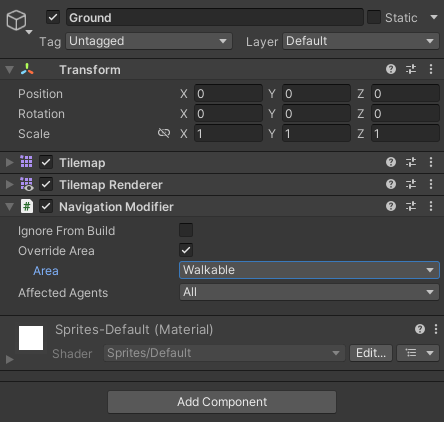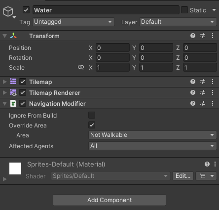 이전에 언급하였듯이, Ground 만 Walkable , Walls 와 Water 는 Not Walkable 으로 설정해준다.