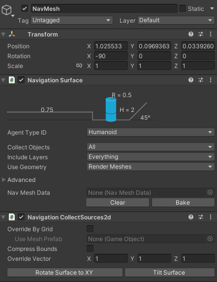 Navigation Surface 스크립트와 Navigation CollectSource2d 스크립트를 추가한다.