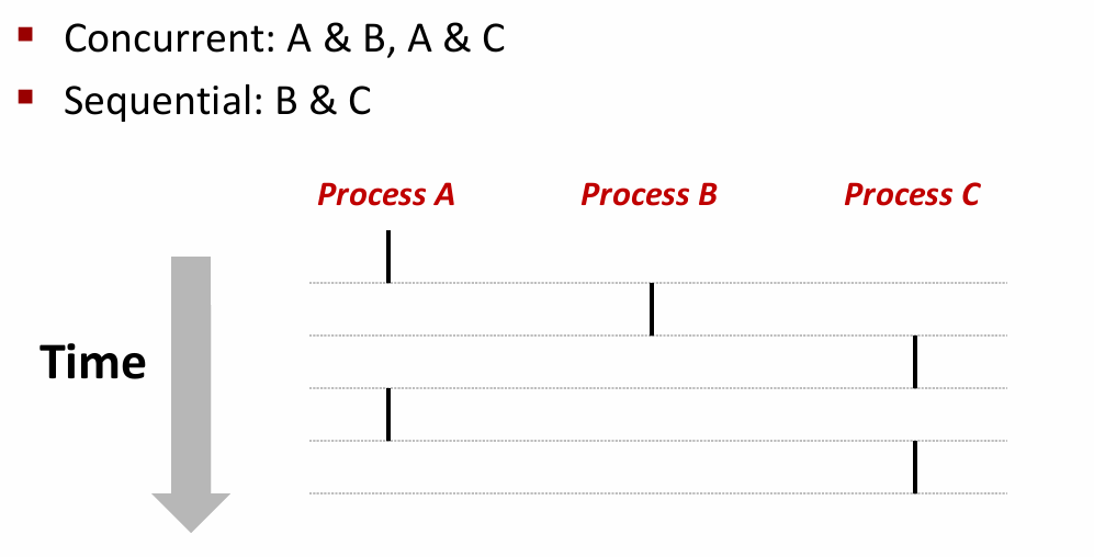 각 프로세스는 logical control flow이다. 두개의 프로세스의 flow가 같은 시간에 overlap 되면 이들은 concurrent하다(run concurrently)고 한다.