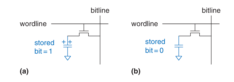 wordline이 HIGH면 nMOS 트랜지스터가 ON이 되고 bitline과 데이터 이동이 일어난다. 위 그림에서 (a)는 커패시터가 VDD에 의해 충전된 상태이고 1을 저장하고있다. (b)는 GND에 의해 방전된 상태이고 0을 저장하고 있다.