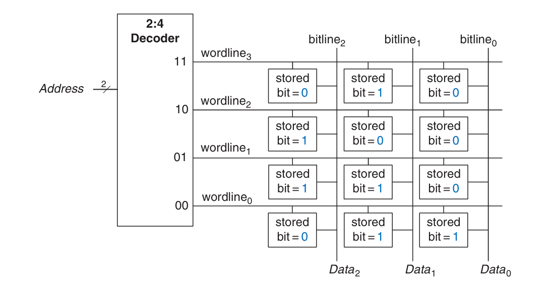 각 주소의 bit 조합에 따라 활성화 할 bit cell이 있는 행의 wordline을 선택한다. wordline이 HIGH일 때, 저장된 bit가 bitline으로 전송되거나 bitline에서 cell로 받아진다. LOW가 되면 연결이 끊긴다(bitline = Z; floating).