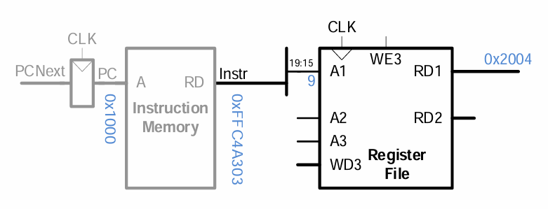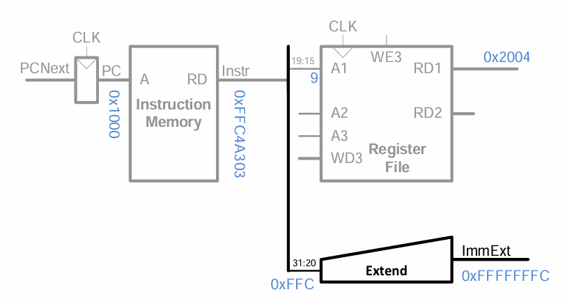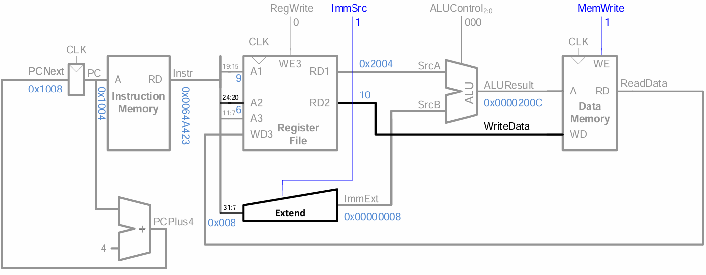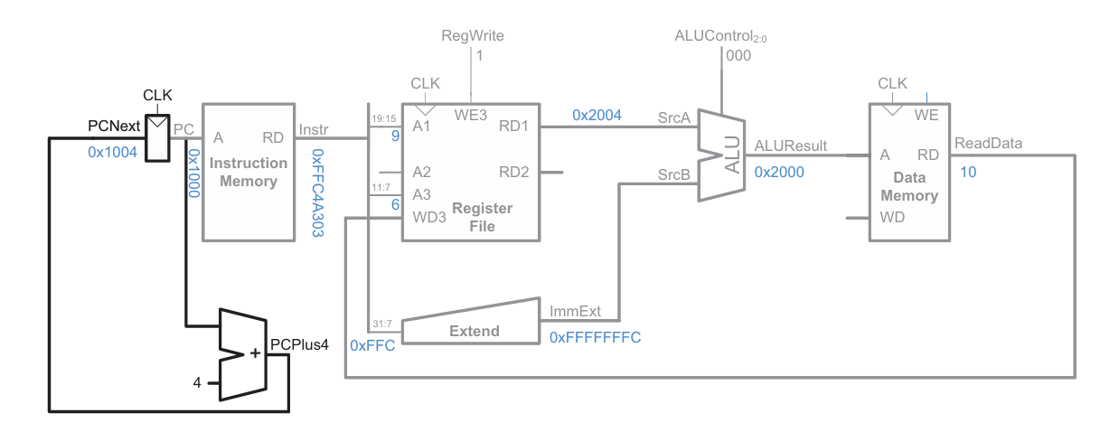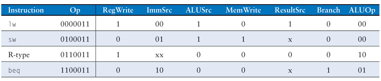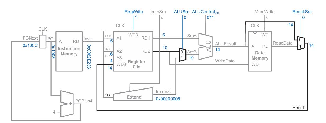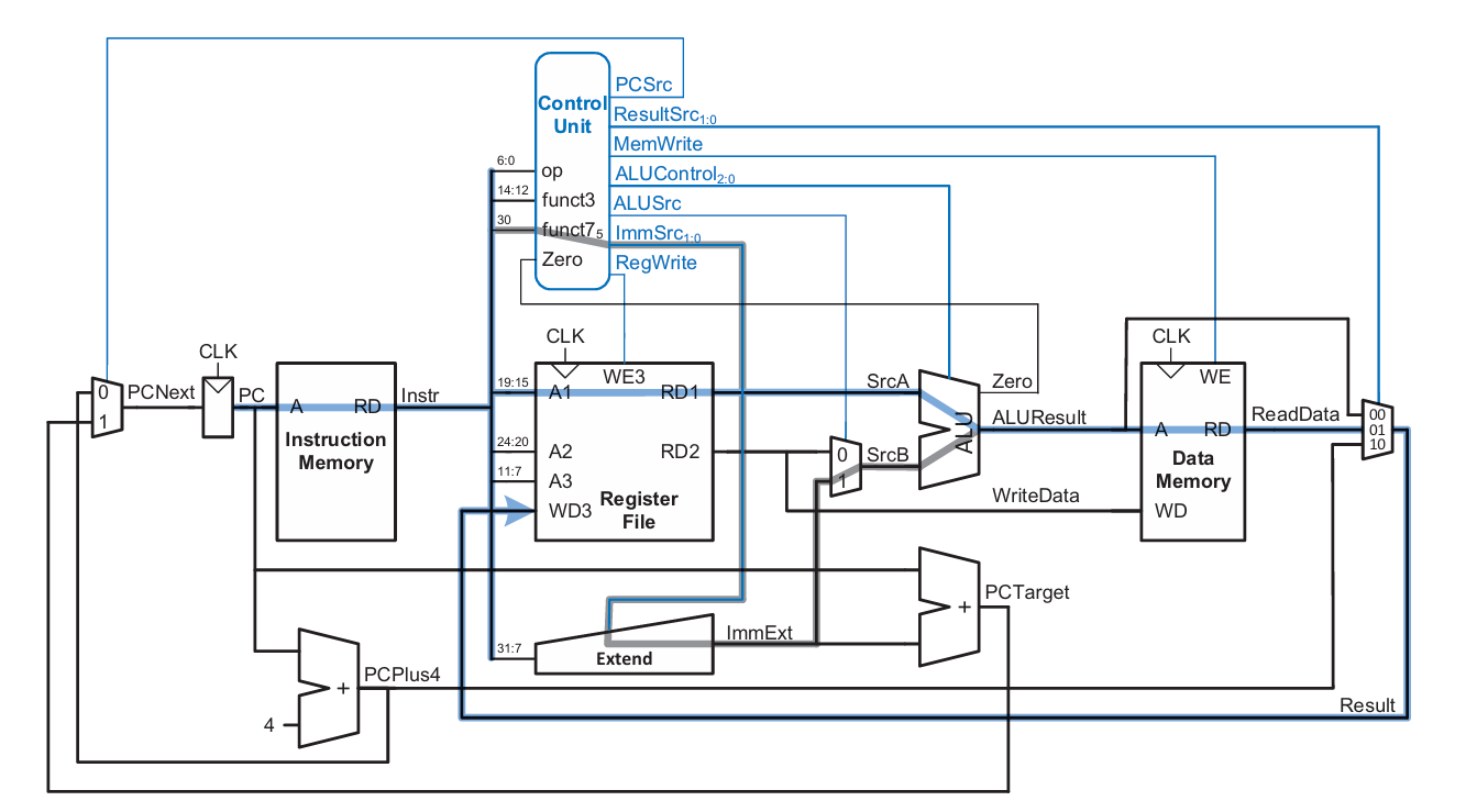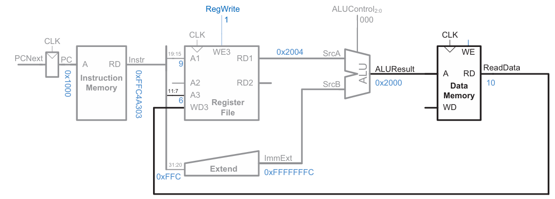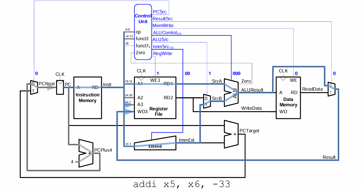 위 표를 보면 R-type에서는 don't care이던 ImmSrc signal이 00이고, ALUSrc를 1로 주어 ALU 연산 소스를 imm으로 바꾸었다. 이후에는 동일하다.