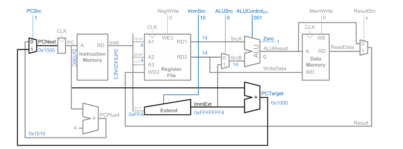 beq는 B-type이고(ImmSrc=10), rs1과 rs2 값을 빼서(ALUSrc=0, ALUOp=01, ALUControl=001) 결과를 zero와 비교하여(Branch=1) 조건에 맞을 경우 PCNext를 PC+imm으로 설정한다.