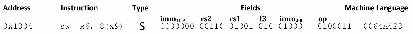 sw는 S-type이고(ImmSrc=01) rs1의 값과 imm 값을 더하여(ALUSrc=1, ALUOp=00, ALUControl=000) 메모리 주소를 구한 후 rs2의 값을 메모리에 쓰고(MemWrite=1) 동작이 끝나기 때문에 Result는 don't care(ResultSrc=x)다. 분기는 일어나지 않는다(Branch=0).
