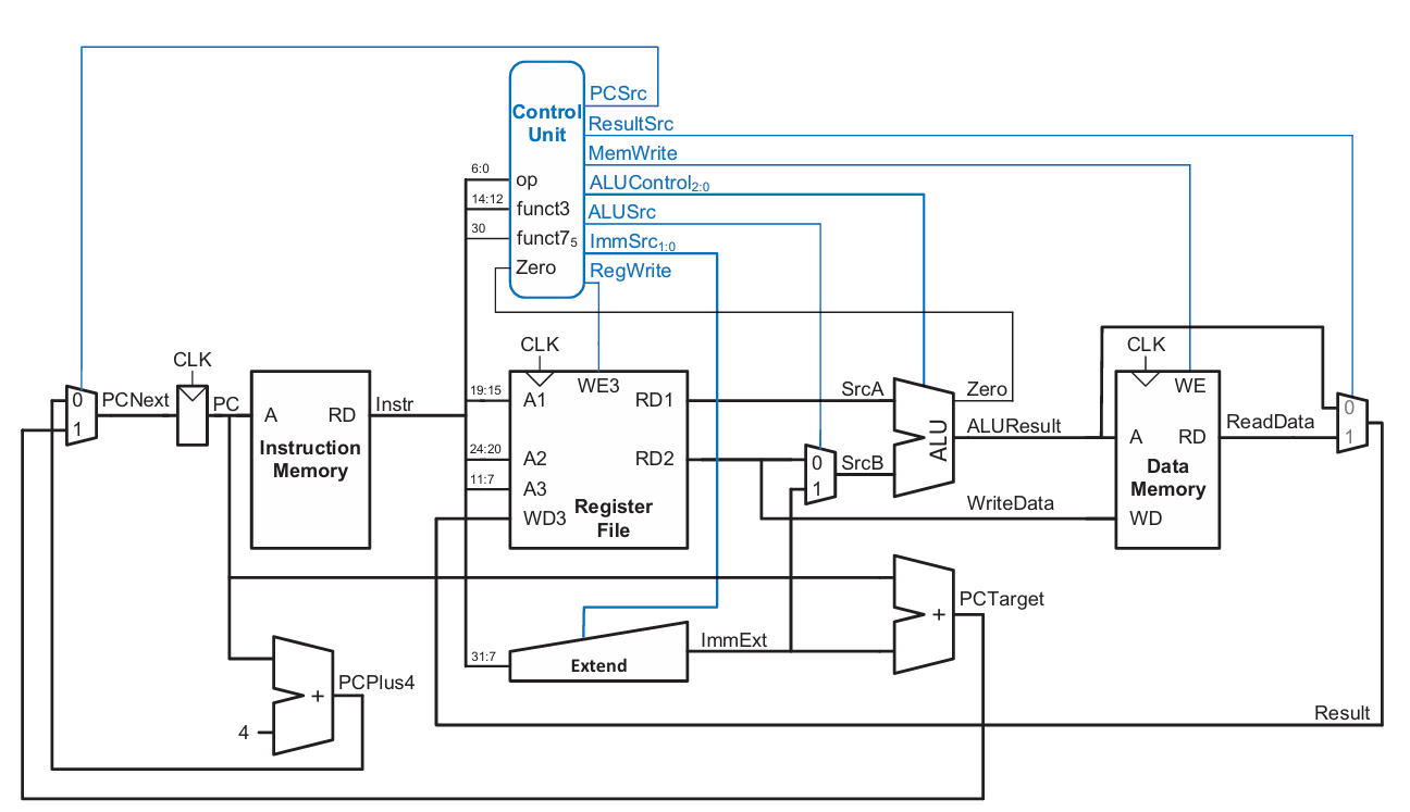 이제 이 datapath에 control unit을 연결하면 간단한 single-cycle 프로세서가 설계된다.