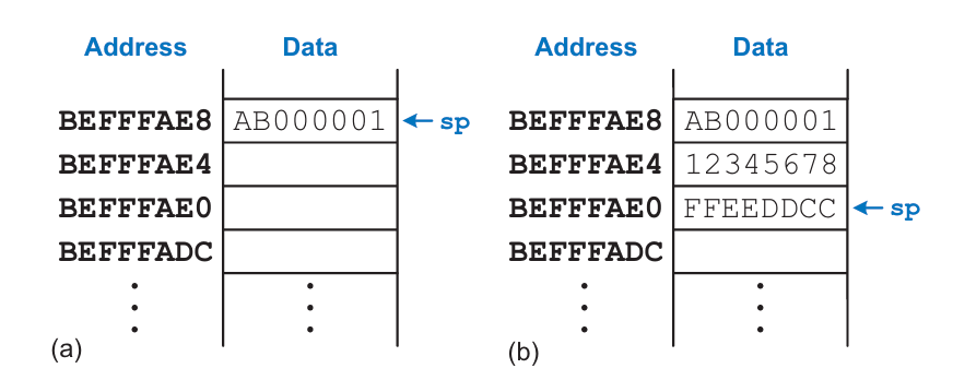 stack은 높은 주소에서 시작하여 아래로 확장되는데, stack의 꼭대기를 sp로 가리킨다.