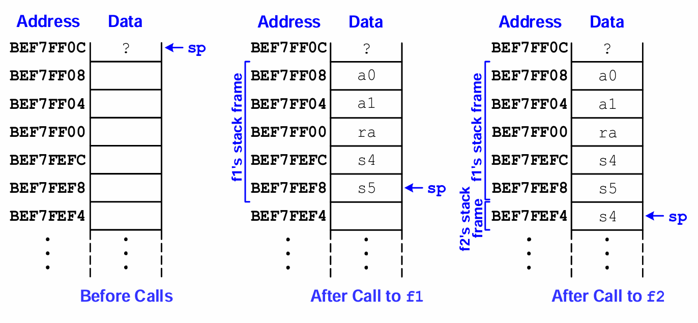 # f1 (non-leaf function) uses s4-s5 and needs a0-a1 after call to f2