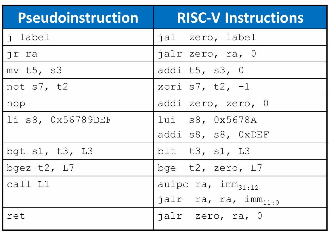 jal rd, imm_{20:0})rd = PC+4; PC = PC + immjalr rd, rs, imm_{11:0})rd = PC+4; PC = rs + imm이 명령어 사용을 조금 더 편하게 만들기 위해 의사명령어(pseudo instruction)이 존재한다.