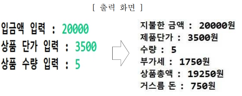 [문제3] 키보드로 금액과 상품단가, 수량을 입력하면 부가세, 상품총액, 거스름돈을 화면에 보여주는 프로그램을 완성해 보세요.