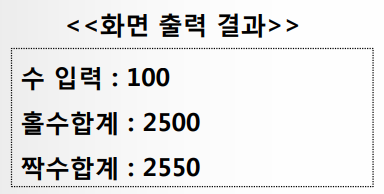 [문제2] 1부터 사용자가 입력한 수까지의 합 구하기 (예 : 100을 입력하면 1에서 100까지의 홀수 합과 짝수 합계 출력)