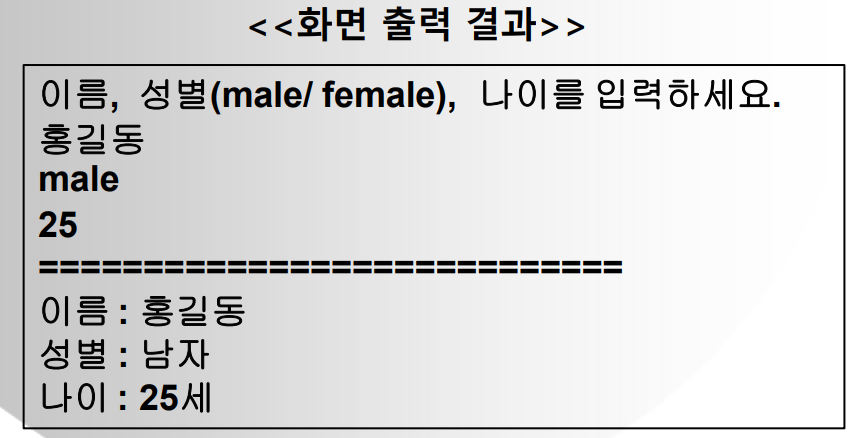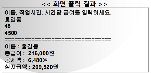 System.out.println("이름, 작업시간, 시간당 급여를 입력하세요");