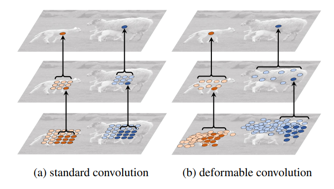 standard convoltion은 filter의 위치가 고정되어 있기 때문에 어떤 물체가 들어와도 동일한 위치로 물체의 특징을 파악하지만 deformable convolution은 filter의 위치가 offset으로 인해 filter의 위치가 변하는 것을 볼 수 있다.