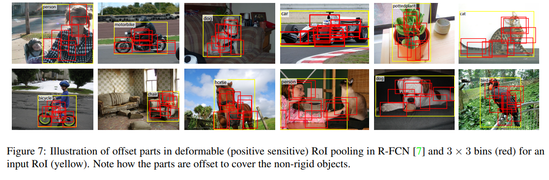 Deformable RoI pooling을 사용했을 때, 좀 더 중요한 정보를 갖고 있는 RoI를 이용한다는 것을 확인할 수 있고, 붉은 사각형의 모양이 object 형태에 따라 다양한 형태로 변형되는 것을 볼 수 있다.