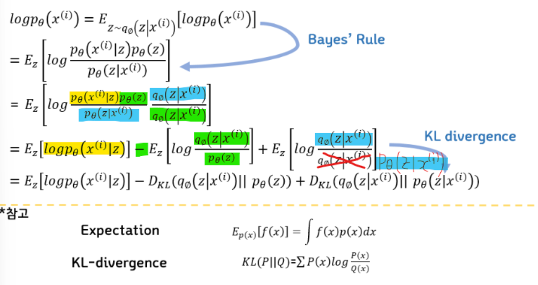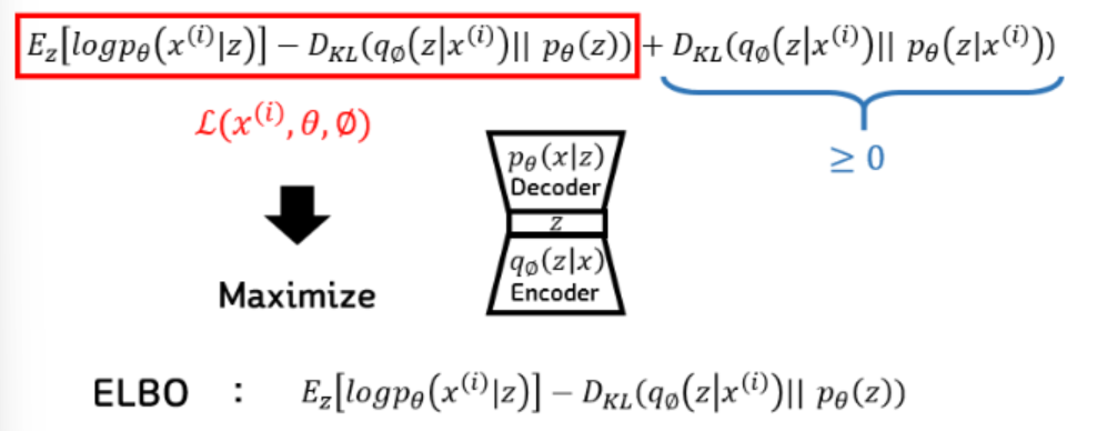 이 식이 KLD라는 것을 알고 항상 0보다 크거나 같다는 정도는 알기 때문에, 앞의 부분을 Lower Bound로 해서 최대화를 시켜주면 전체 식을 최대화 한것과 같다는 결론이 나온다.