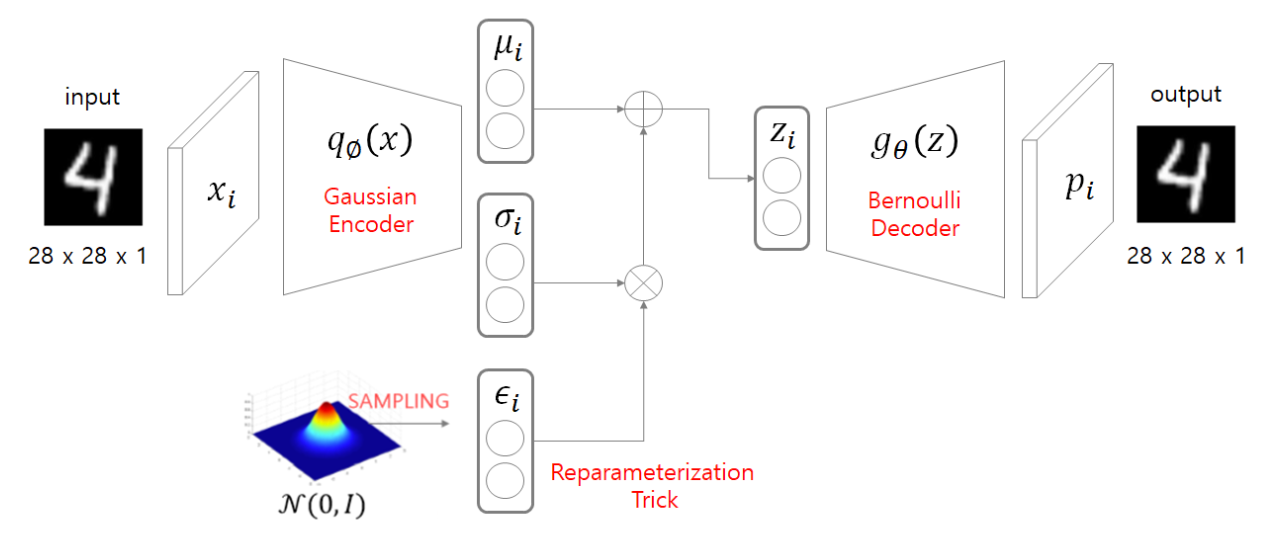 평균과 표준편차를 알면 정규분포를 만들수 있고, 이 분포에서 z를 샘플링하고 Decoder를 통과하여 input과 비슷한 분포를 가진 데이터를 생성할 수 있다.