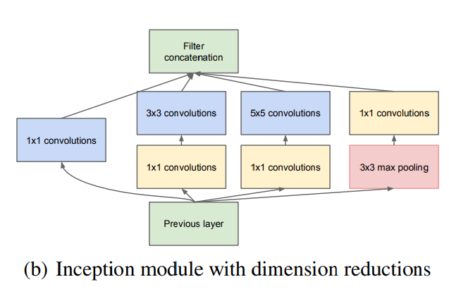 새로운 버전의 Inception 모듈은 1x1 conv를 제외한 각각의 conv layer 앞에, pooling layer에는 뒤에 1x1 conv를 적용시켜 dimension reduction(차원축소) 효과를 보게 했다.