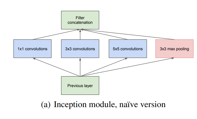 Inception의 주요 아이디어는 convolutional vision network에서 최적의 local sparse 구조를 어떻게 하면 현재 사용 가능한 dense component로 구성할지에서 기반을 했고 본 논문의 Inception에서는 편의를 위해 filter size를 1x1, 3x3, 5x5로 제한했으며 Pooling이 CNN의 성공에 있어 필수 요소기 때문에, 1x1, 3x3, 5x5 conv layer에 이어 pooling도 추가했다고 한다.3✕3, 5✕5 비율의 convolution이 높은 계층으로 갈 수록 증가하는데 5✕5 convolution의 수가 많지 않더라도 이 convolution은 수많은 필터를 갖는 convolution 위에 추가하기엔 상당히 연상량이 높아서 안좋다. 또한 Pooling 계층의 출력을 convolution 계층의 출력과 합치는 것은 단계별로 출력의 개수를 늘릴 수 밖에 없기에 이 아키텍처는 최적의 sparse 구조에 매우 비효율적이라고 한다.
