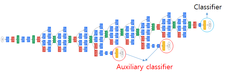 GoogLeNet에서 처음 도입된 개념(Training을 잘하도록 도와주는 보조 역할)