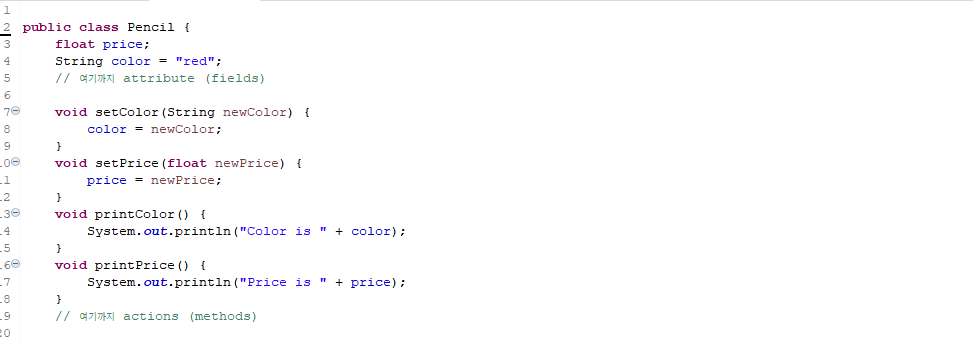 class Pencil을 생성하고 가격(price), 색깔(color) 을 입력받는 함수와 print하는 함수를 포함해라 .