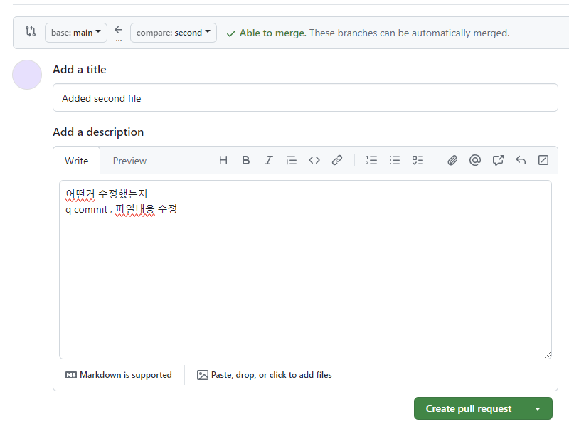 Merge pull request 클릭 -> 다 합쳐지면 main에 second.txt 가 추가 되어 있다 (업데이트 원래 없었던 건데 합쳐지면서 생김 )