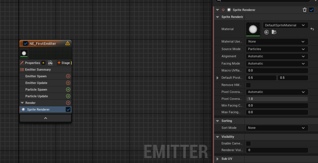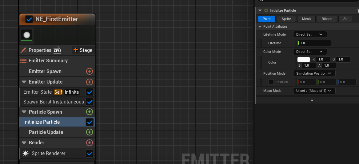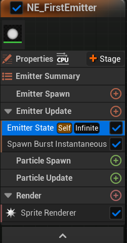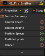 이것은 이미터의 tick이라고 생각하면 된다. 이 스테이지에는 많은 것을 넣을 수 있는데 가장 중요하는 것은 생성하는 파티클이다. 따라서 이 스테이지에서 가장 중요한 것은 이미터가 스폰하는 파티클 수를 지정하는 것이다. 이 스테이지에 넣는 모듈에 따라 스폰되는 파티클이 달라진다.