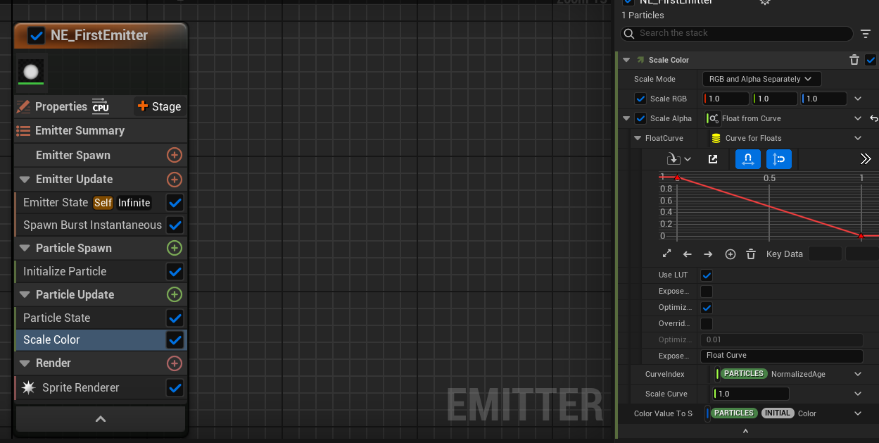 마지막인 Particle update에서 scale color을 설정해주고 scale alpha에서 float from curve를 설정해주니 표시되던 공이 사라지는 것을 볼 수 있다.