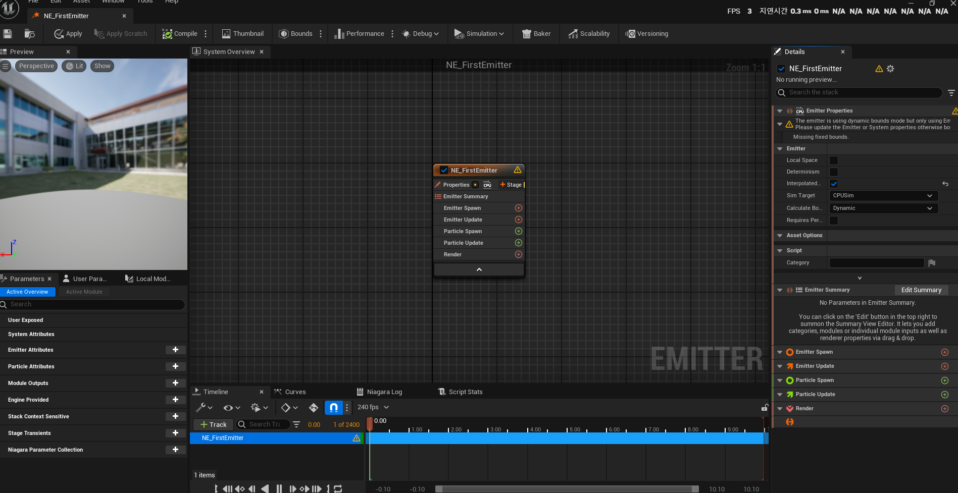 나이아가라 이미터를 추가해주었다. 정말 처음 보는 구조의 화면이다.