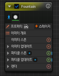 Emitter spawn은 언리얼 언어로 beginplay()와 비슷하고 Update는 Event Tick과 비슷하다.