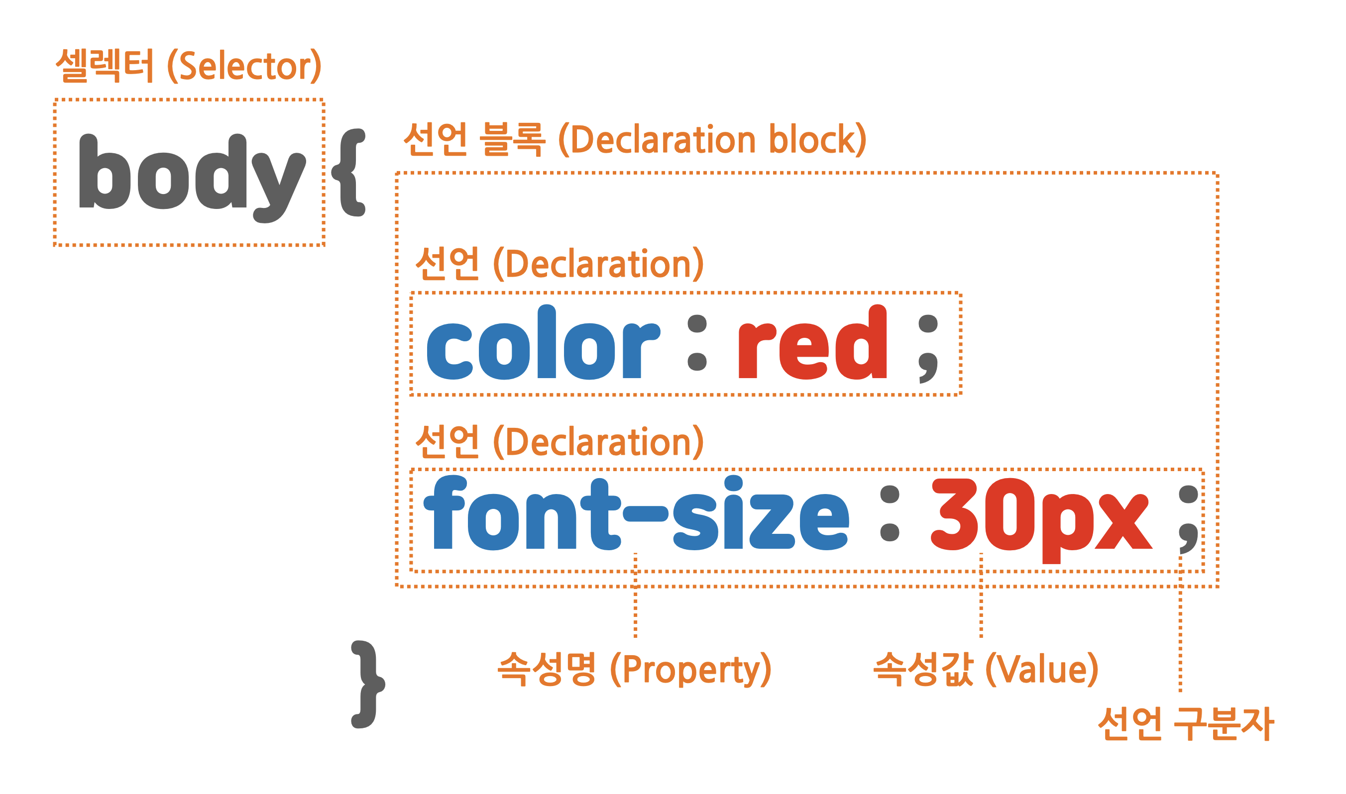 셀렉터로 특정 요소(요소 이름, id,class)를 선택하고, 선언블록({}) 안에서 적용할 내용을 작성한다. 이렇게 적용할 수 있는 내용을 속성(색상, 글자 크기 등)이라고한다. 속성명에 속성값을 할당하여 스타일을 표현하며 값의 끝에는 세미콜론(;)을 속성끼리 구분한다.