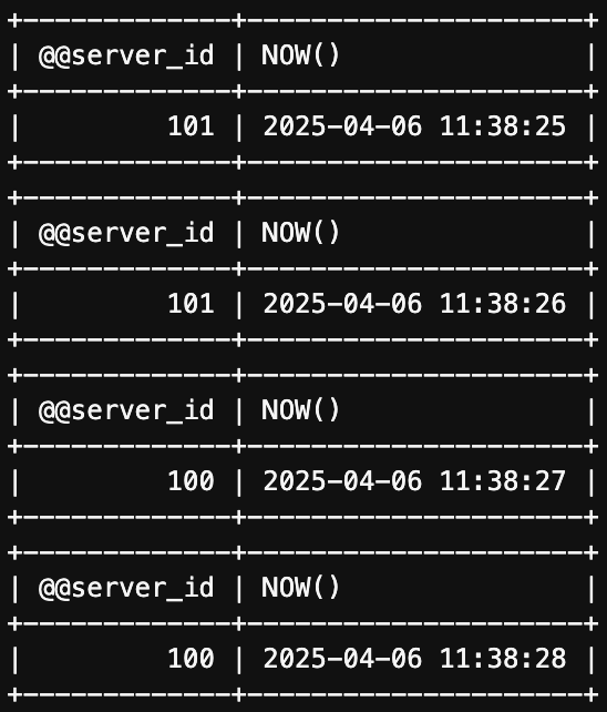 bash -ic "while sleep 1; do mysql -h mysql-read -e 'SELECT @@server_id,NOW()'; done"