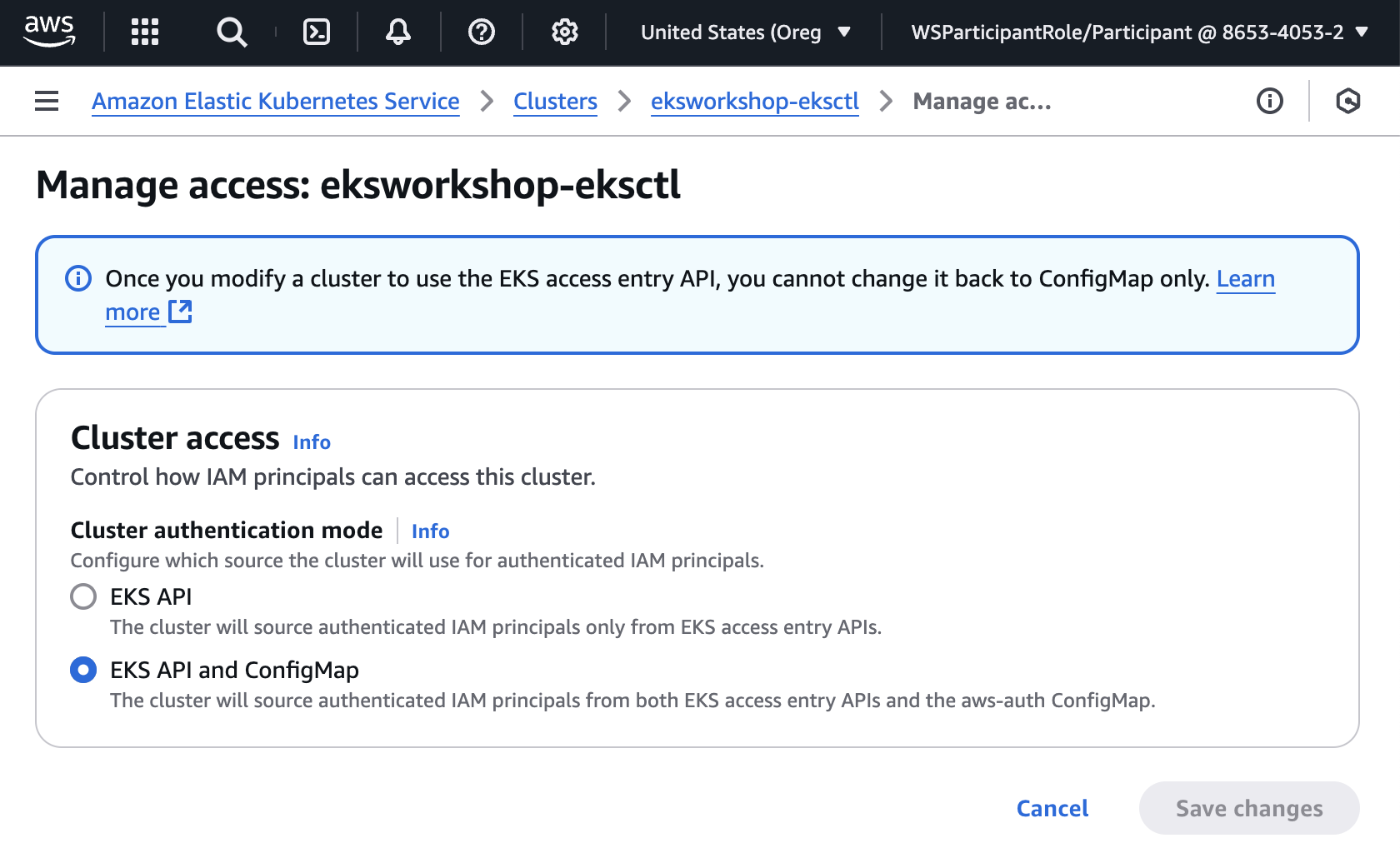 관리 콘솔에서 옵션을 확인해보면, 현재 상태는 기존의 aws-auth configmap을 수정하는 방식과 새로운 EKS access entry API를 모두 사용할 수 있는 상태이다.