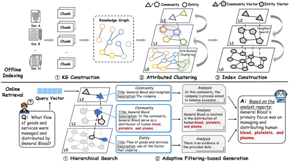 그래프가 너무 크면 좋지 않다. 모든 그래프의 내용을 탐색할 수 없을 것이다. 따라서 우리는 그래프를 “의미적으로 응집된 부분 그래프(community)”로 분해한다. 이후에는 이것을 계층적으로 나눈다. 저차원으로 갈 수록 구체적 사실의 묶음이고, 고차원으로 갈 수록 추상화된 정보가 담기는 식이다.