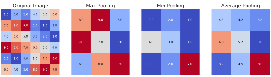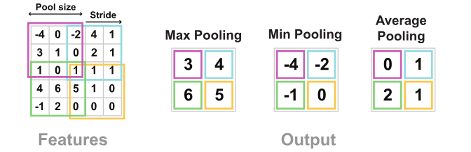 풀링 층은 합성곱 층의 결과 물로 생성되는 Feature Map의 크기를 줄이는 역할을 한다. 계산량을 줄이는 것이 주목표이며, 어떤 풀링을 사용하냐에 따라 불변성에 대한 처리가 가능하다.