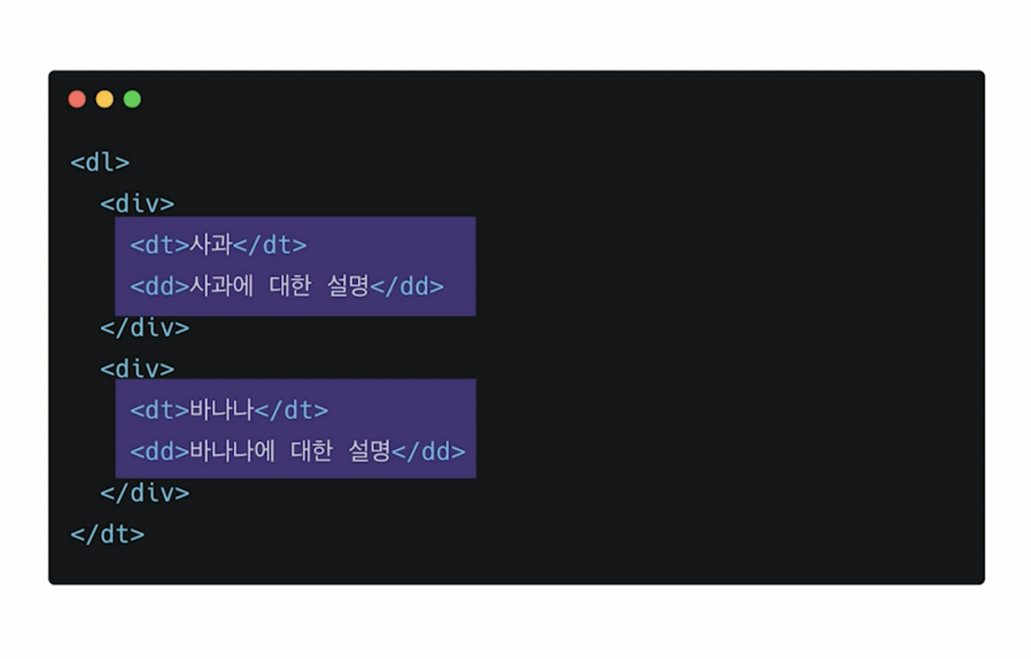 <dl> <dt> <dd><dl> 은 정의리스트를 만들거라는것을 명시한다. (<ul> <ol> 과 비슷)
