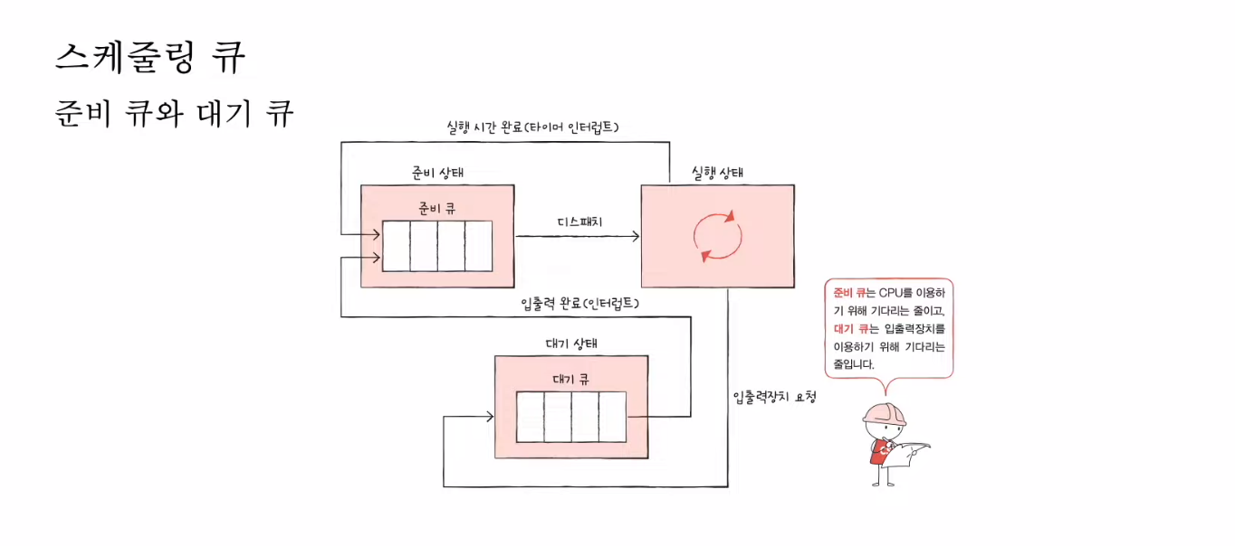 이런 비효율적인 것을 해결하고자 OS 는 스케줄링큐를 사용한다.