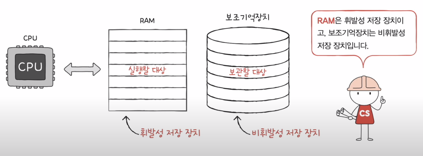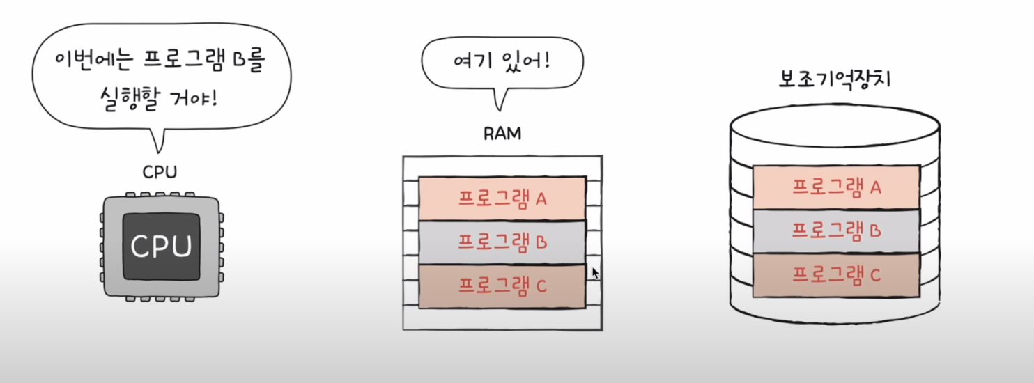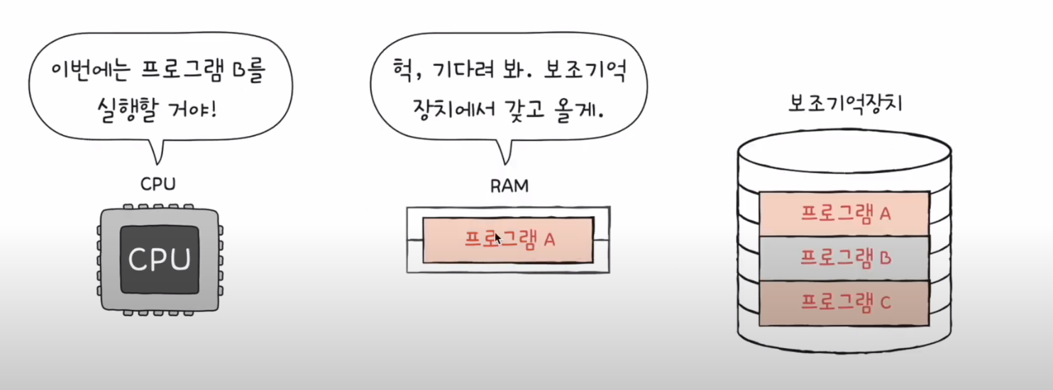 아래에 그림에서 CPU 는 주기억장치랑만 상호작용하고 RAM 은 보조기억장치랑만 상호작용한다.
