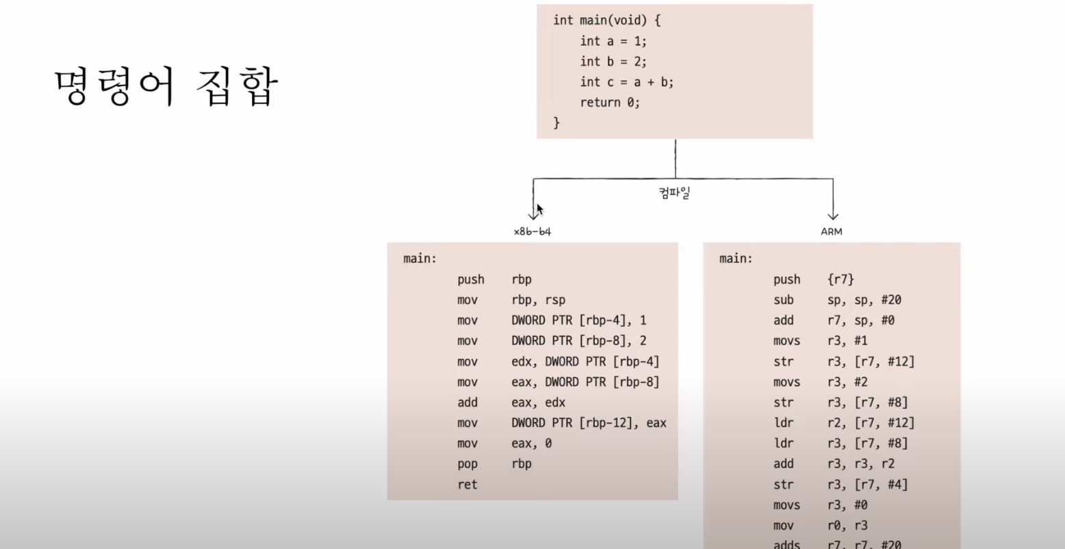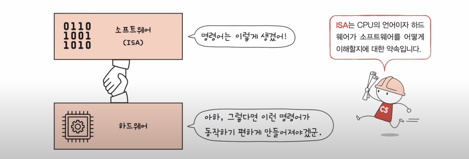 명령어 집합 구조 = (ISA, Instruction set architecture) : CPU가 이해할 수 있는 명령어들의 모음