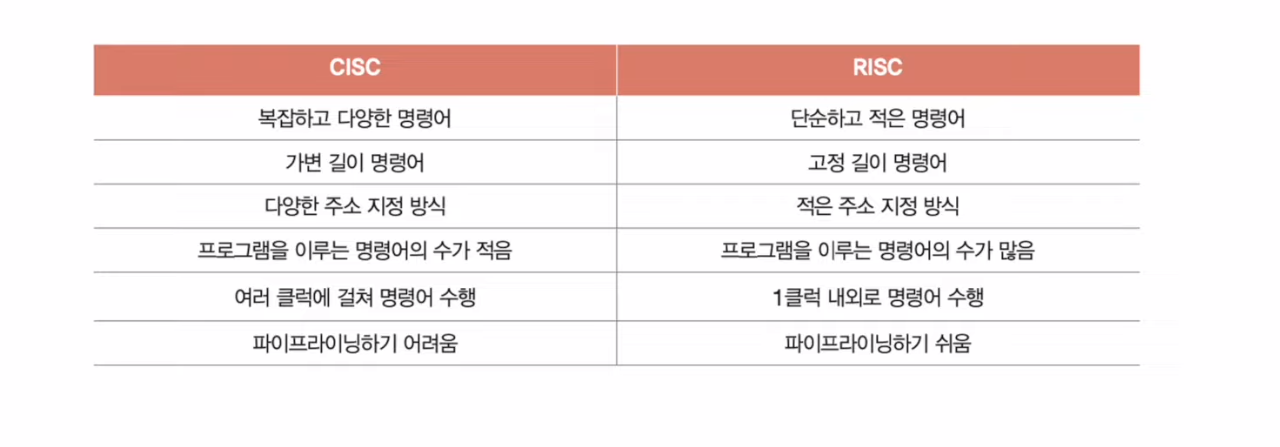 그리고 명령어가 다르면 명령어 해석 방식, 레지스터의 종류와 개수, 파이프라이닝의 용의성, ... 등이 많은 것들이 달라진다.