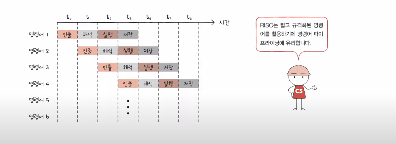 RISC는 짧고 규격화된 명령어를 활용하기에 명령어 파이프라이닝에 유리하다.