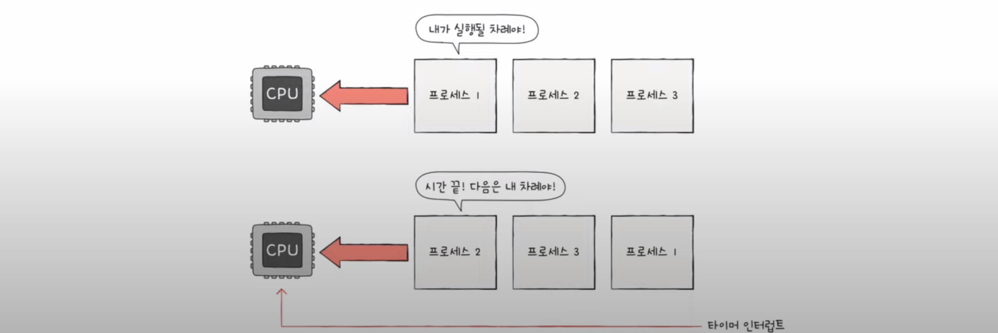 - 타이머 인터럽트가 발생하면 차례 양보