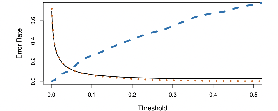sensitivity 를 증가 시키려고 임계값을 0.2로 조정하면, 전체 error rate이 증가함 ->trade off