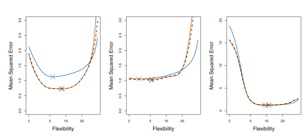 → 이러한 관점에서, 맨 왼쪽 LOOCV , 10-fold CV 는 test error을 underestimate했지만 minimum point를 잡아냈다는 점에서는 의미가 있음.