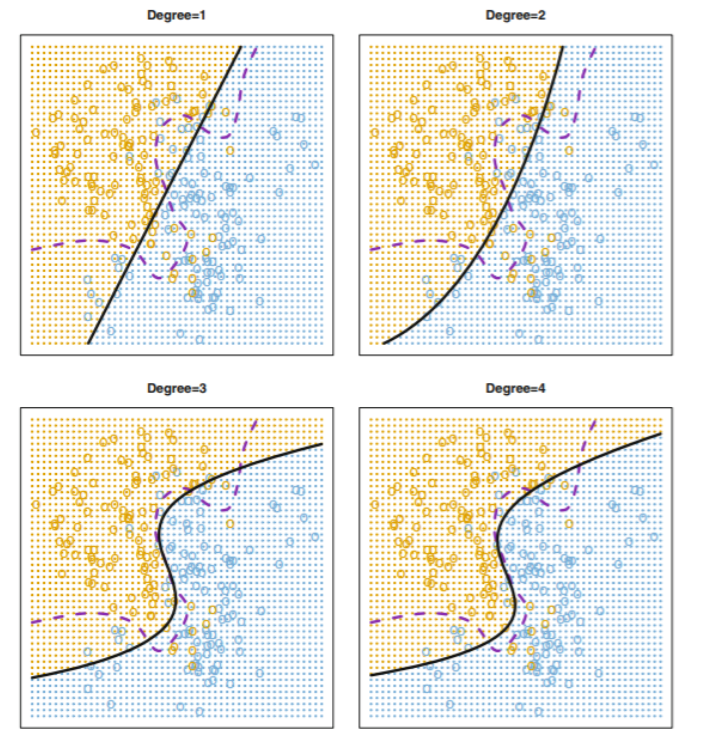 linear model일 때보다, 2차일 때 test error가 확실하게 줄고 그 이상으로는 눈에 띄는 효과는 없음